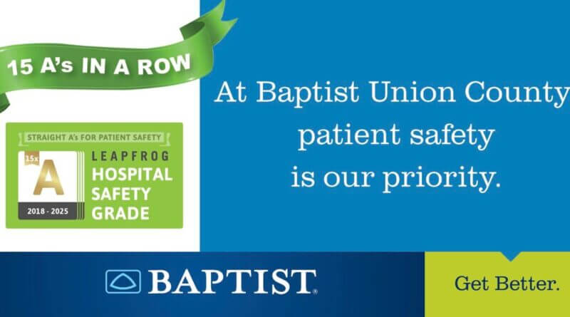 Baptist Memorial Hospital-Union County has received an ‘A’ Hospital Safety Grade from The Leapfrog Group for the 15th consecutive time, according to a news release from the hospital.
